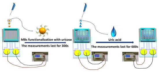 Studies of interference were conducted. MBs modified with uricase were added to cover the reaction chamber with a micropipette. After 400 s, the electrical signal was stabilized, and 20 μL of urea and glucose solution of 1 mM concentration were added to the reaction chamber. Then, 20 μL of uric acid solution with a concentration of 1 mM was added, and the voltage change of the solution was measured using the sensor.