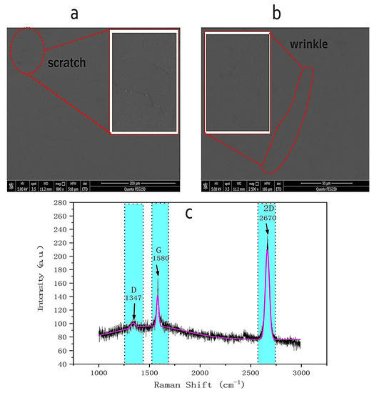Scanning electron microscope (SEM) analysis was used to determine the morphology of graphene. SEM photomicrographs made at 800× magnification of graphene on a glass substrate are shown in Figure 5a. Graphene on a transferred sapphire substrate was a continuous film with a few scratches on the surface. These scratches formed during the transfer. SEM photomicrographs made at 2500× magnification of graphene on a sapphire substrate are shown in Figure 5b. Except for a small number of wrinkles, no resides were observed, which indicates that the graphene surface is clean. The quality of the graphene on a sapphire substrate was further measured by the Raman spectrum. As shown in Figure 5c, the three main peaks of graphene, such as D, G, and 2D peaks, were located near 1350 cm−1, 1590 cm−1, and 2700 cm−1, respectively. The related assignments of spectral peaks to chemical bonds can be found in our previously published works [28,29,30]. By comparing the intensities of G and 2D peaks, the I2D/IG ratio was about 2, and more than 90% of the graphene film was determined as a single layer. In addition, the relatively weak D peak and the large 2D peak indicated the high quality and low defect density of graphene.