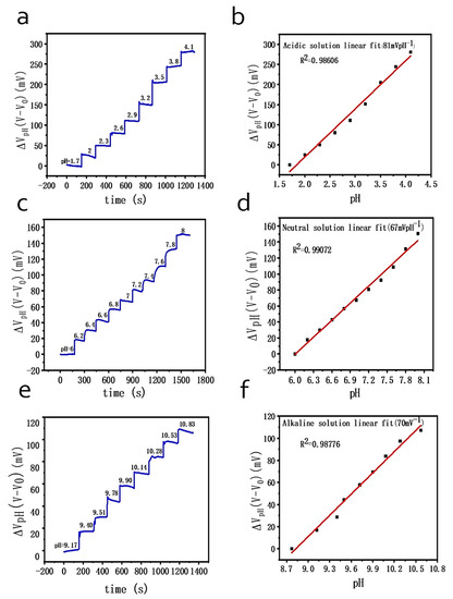 The voltage is a linear function of acidic solutions (a), neutral solutions (c), and alkaline solutions (e) with different pH values. The linearity for pH detection at pH = 1.7–4.1 (b), pH = 6–8 (d), and pH = 9.17–10.83 (f).