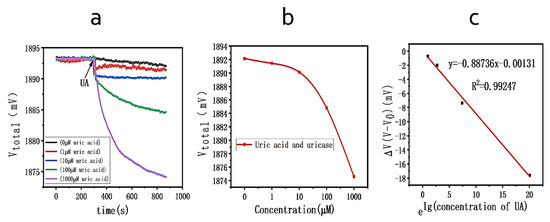 As shown in Figure 7a, measurements indicated that the source–drain voltage (Vtotal) of the graphene sensor decreased to varying degrees with the addition of different concentrations of uric acid. Figure 7b shows a similar standard curve extracted from the endpoint voltage (after 800 s) change. Experiments proved that a graphene chemoresistor based on magnetic beads can operate over a wide sensing range of uric acid concentrations (0 μM–1000 μM), which includes the clinically relevant range of uric acid in human serum (178 to 715 μM) [32]. In this study, the sensitivity of the sensor to detect UA was 5.6 mV/decade, and a good linear relationship (R2 = 0.995) was obtained when the UA concentration was changed from 0 μΜ to 1 mM, as shown in Figure 7c.
