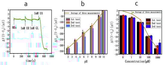 (a) Effect of potentially interfering substances on sensor response upon adding 1 mM glucose (GL) and 1 mM urea (UR) to 1 mM uric acid solution. (b) The three consecutive measurements of changes in pH at pH = 2–11. (c) Repeatability test of the UA sensor.