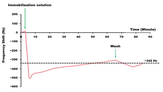 Figure 1 shows the QCM frequency shift when exposing it to the mixture containing thiolated-ssDNA and L-cysteine. Clearly, the frequency drops after exposure and reaches the equilibrium value after roughly one hour. The reason for the exact shape of the response curve is not fully clear but most probably a consequence of the fact that DNA molecules come with very high charge density, which of course influences the signals [27,28,29,30]. Furthermore, the response behavior also demonstrates irreversible, covalent binding of the species to the electrode surface: the signal remains constant after washing.