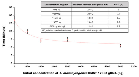 In the same way as other amplification strategies, LAMP of course does not allow for (precise) quantitative analysis. However, measuring amplification in-situ actually opens up a way for at least reasonable estimating the bacteria load of a contaminated sample: as long as the concentration of the target analyte is lower than the lower limit of detection (LoD) of the QCM sensor, there should be no signal visible. This only changes once the concentration of the target product has reached that value. Therefore, the time between injecting a sample and the onset of the frequency decrease due to binding of the LAMP product should be indicative of the initial sample concentration. To assess this hypothesis, we tested five different initial concentrations of L. monocytogenes DMST 17303 gDNA samples. Figure 4 shows the results: when injecting a LAMP mixture containing approximately 0.8 ng of L. monocytogenes gDNA, starting amplification led to a signal onset after 27 min It is worth noting that this clearly showcases an added advantage of the QCM-based assay: turbidity measurements at 650 nm showed a signal only after 46 min [21]. Switching to measuring on the QCM in situ hence improves sensitivity by decreasing the measuring time. Increasing the initial amount in the mixture to 800 ng gDNA reduces the signal onset time to 20 min. At the highest amount tested—6400 ng—one can distinguish the signal after 11 min. According to literature, precision at below 20% [32] confidence interval is acceptable for such measurements. The onset times of this QCM system show relative standard deviations from 6% to 10% of the working range of initial DNA concentration and thus meet this requirement. The trend line also shows a clear correlation between the onset times and initial concentrations of L. monocytogenes gDNA. In-situ QCM measurements, especially in the lower concentration range, i.e., until adding up to 800 ng initial DNA to the sample, reveal that the onset time of the frequency shift very strongly depends on the initial concentration. Above that, the signal basically saturates. Given that legislation for ready-to-eat food strictly requires a “zero tolerance” policy of Listeria monocytogenes contamination, the sensor meets the legal requirements. However, it goes even beyond them by assessing if bacteria contamination is low or high. Despite not being of regulatory value, it still adds a piece of information that may be useful for elucidating the possible source of contamination.