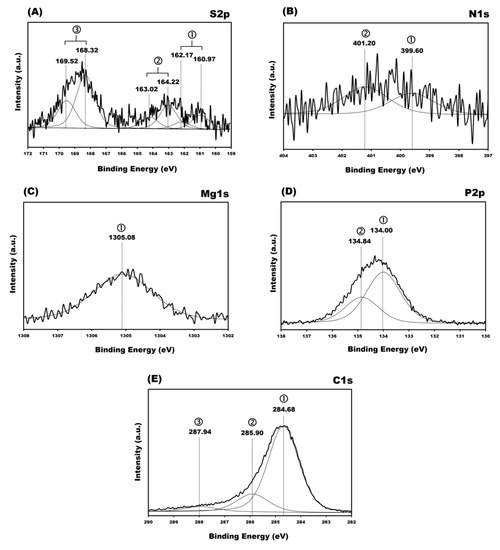 High-resolution XPS spectra of L-cysteine/ssDNA hybridize to the target sequence of LAMP amplification products on Au electrode. (A) S2p, (B) N1s, (C) Mg1s, (D) P2p and (E) C1s.