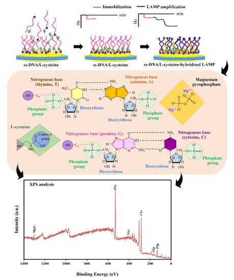 LAMP amplification generates stem loop DNA with various stem lengths and structures containing multiple loops. It also releases the reaction by-product, magnesium pyrophosphate. Thus, one can confirm hybridization of target DNA LAMP products with ssDNA probes on the QCM surface by the presence of large amounts of nitrogen from nucleobases and phosphorus from phosphate originating from both the DNA backbone and magnesium pyrophosphate (by-product of LAMP) [14]. Figure 5B shows that the N1s spectrum resolves into two peak components with BEs of 399.60 and 401.20 eV. The higher BE peak at 401.20 eV corresponds to N1s from cytosine and adenine [43], to N–(C=O)–N from thymine of double-stranded DNA, and to -NH2 from L-cysteine. The peak at the lower BE peak is attributed to conjugated –N= [43].