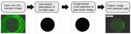 To determine the number of target cells present in the sample/retained on the filter, a Matlab-based code was developed based on the circular Hough gradient transformation as alternative for the cellSens Dimension software module. The general framework for the image processing is displayed in Figure 1.