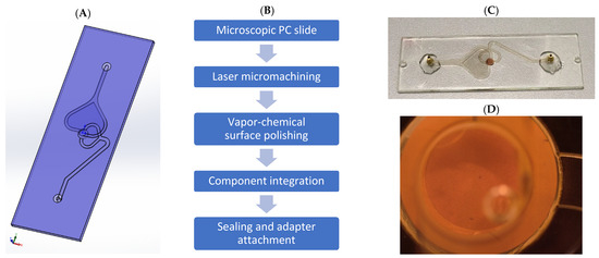The cell capture device was designed for and implemented into injection-molded polycarbonate (PC) slides with a size of 75.5 mm × 25.5 mm × 1.5 mm. Figure 2 gives an overview of the steps involved in the fabrication process: First, a computer-aided design (CAD) layout of the filtration unit with inlet and outlet channels was designed. The designed microfluidic structures were then micromachined into the PC slides by ultrashort pulse laser ablation (Nd:YAG laser, Lumera GmbH, Kaiserslautern, Germany; Laser scanning optics and CNC stage, GFH GmbH, Deggendorf, Germany). After laser micromachining, the surface of the polymer parts was polished by a vapor-chemical treatment as it was developed in [33], to improve the optical transmittance of the filtration unit and enable a sufficient sealing with the sealing foils. Before the sealing of the microfluidic structures, the filter component (e.g., a Transmission Electron Microscope (TEM)-grid, see next section) was implemented into the device through a microdispenser via adhesive bonding (UHU plus sofortfest 2 Komponenten-Kleber, UHU, Bühl/Baden Germany).