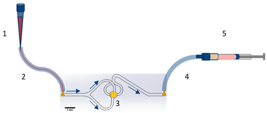 The structures were sealed with an adhesive film (MicroAmp™ Optical Adhesive Film, Thermo Fisher, Waltham, MA, USA) and tube adapters were attached to the inlet and outlet of the device via adhesive bonding (UHU plus schnellfest 2 Komponenten-Kleber, UHU, Bühl, Germany). After a curing time of 12 h, the device was ready for use.