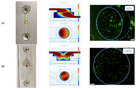 Design, simulation, and experimental determination of flow through area for cell retention on two filter holder designs. Design (A) contained a single inlet and outlet channel on the top and bottom of the slide. A flow rate of 2 µL/s resulted in a flow through area of ~60%. For the adapted design (B), the inlet was divided into two strands, which reach the filter the opposite way and slightly offset. Furthermore, the outlet was divided into two strands leaving the filter at 90 degrees from the inlets. A flow rate of 2 µL/s resulted in a flow through area of close to 100%.