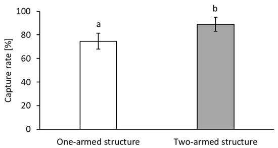 Capture rates of BT-474 cells spiked into 200 µL of blood and drawn through the TEM-grids integrated into the different filter holder slides. The capture rate was significantly increased by the filter holder design with the divided inlet and outlet channels. Results are given as means ± SD. Different letters above the bars (a and b) indicate statistical difference (n = 3; p < 0.05).