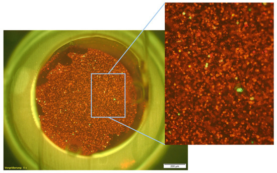 In order to enable automated cell detection, a Matlab-based method was established and compared to the Count and Measure Solution of the CellSens software. Hereby, the stained cells were imaged in the respective fluorescence channel, and afterwards an adaptive or manual threshold could be set so that all cells with a fluorescence intensity above the set threshold could be counted in the integrated Count and Measure Solution. Additionally, a different filter for sphericity and minimal diameter was set in order to exclude artefacts from the count. The CellSens-based evaluation was accurate when the threshold, filters for cell sizes, and sphericity were set accordingly. However, as seen in Figure 10, manual correction was necessary to count single cells in aggregates or in close proximity to each other. As seen in Figure S5, the Matlab-based evaluation was more accurate in the recognition of single cells within an aggregate. Altogether, using the Matlab framework of the digital image processing for cell recognition, comparable results were obtained as in the manually corrected CellSens-based evaluation that was regarded as reference at 100% (see Figure 10).