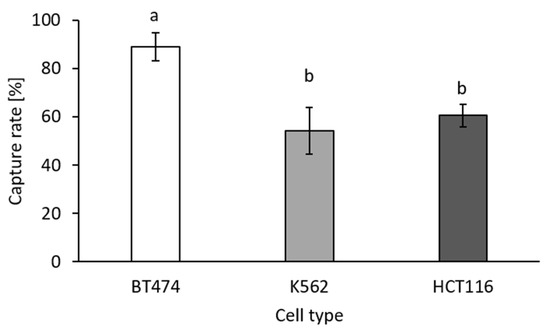 Capture rates for cell lines BT-474 (n = 5), K562 (n = 4), and HCT116 (n = 10) spiked into whole blood samples and filtration at a constant flow rate of −2 µL/s as determined by end-point detection. Results are given as means ± SD. Different letters (a and b) above the bars indicate statistical significance, results with the same letters (b and b) are not significantly different (p < 0.05).