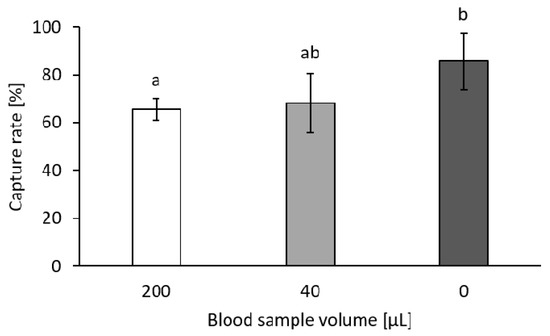 HCT116 cell capture rate dependent on the whole blood sample volume. Stained cells were spiked into 200 µL and 40 µL whole blood or 1 × PBS/1% BSA/1 mM EDTA as control. Results are given as means ± SD. Different letters (a and b) above the bars indicate statistical difference (n = 5; p < 0.05).