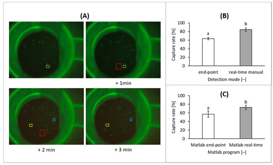 In comparison to end-point detection of the captured cells after filtration, real-time detection had the advantage that even cells passing the filter after a certain time were taken into account for quantification. Thus, the number of detected cells could be significantly increased, even though not all of the cells could be recovered for further analysis.