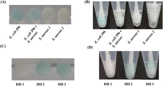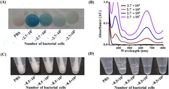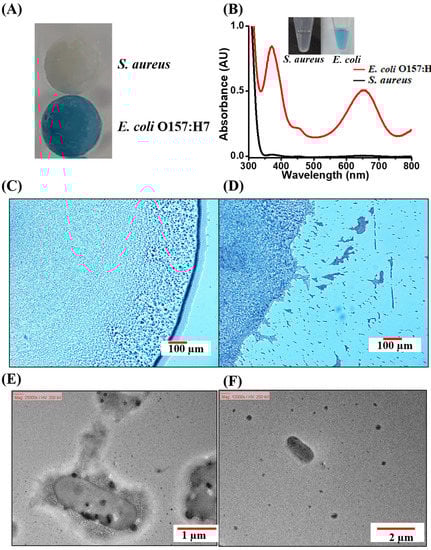 Most Gram-negative bacteria, such as E. coli, contain high amounts of peroxidases [], which have been used in catalyzing the conversion of colorless 3,5,3′,5′-tetramethyl benzidine (TMB) into visible oxidized TMB with a blue color in the presence of H2O2 [,,,]. Supporting Information Scheme S1 in the Supplementary Materials shows the peroxidase reaction when TMB is used as a substrate in the presence of H2O2. At this point, the color of the resultant reaction is blue, whereas the reaction color changes to yellow when sulfuric acid is added to stop the reaction []. Owing to the existence of endogenous peroxidases in E. coli O157:H7, peroxidase-based colorimetric reactions have generally been used in determining the presence of E. coli O157:H7 under standard buffer conditions at the lowest detectable concentration of ~105 cfu mL−1 []. However, most existing methods that use peroxidases for the visualization of the presence of Gram-negative bacteria still require overnight culture before peroxidase reaction tests can be carried out [,,,,]. Moreover, Gram-positive bacteria, such as S. aureus, contain abundant catalases [] that can catalyze the generation of oxygen in the presence of H2O2 [] (SI Scheme S1). Satisfactory results, in which the limit of detection (LOD) of E. coli O157: H7 is as low as ~103–104 cfu mL−1, can be obtained after 4–6 h of bacterial culture before PCR analysis []. However, PCR analysis is time-consuming and labor-intensive because tedious sample pretreatment steps must be completed before the analysis can be performed [].