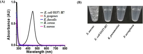 - Ramasamy, M.; Yi, D.K.; An, S.S.A. Enhanced detection sensitivity of Escherichia coli O157: H7 using surface-modified gold nanorods. Int. J. Nanomed. 2015, 10, 179–190. [Google Scholar]