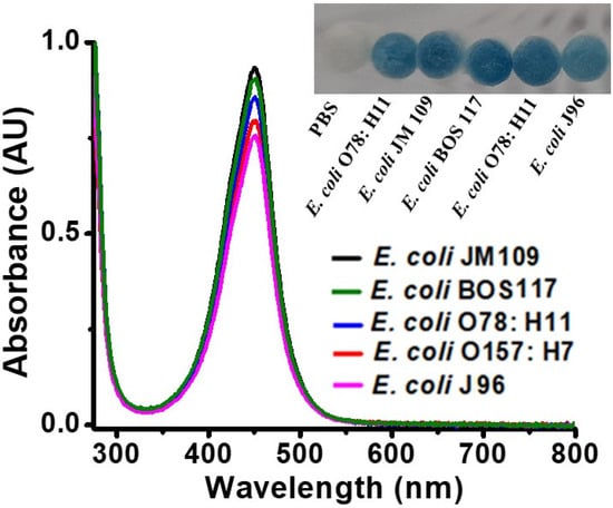 Different strains of E. coli, including E. coli JM109, E. coli J96, E. coli O78:H11, and E. coli BOS 117 were also used as the model bacteria, to examine whether the current approach was effective for these different E. coli strains. E. coli O157:H7 was also examined again for comparison. The optimal reaction conditions obtained above were applied to conduct the reaction. The inset in Figure 4 shows the photographs of the resultant samples of different E. coli strains were obtained after reacting with TMB in the presence of hydrogen peroxide. All the cotton swabs became blue, indicating that the method can be used to sense the presence of different E. coli strains. Figure 4 shows the resultant UV–Vis absorption spectra of these E. coli samples, obtained after the reaction with TMB in the presence of hydrogen peroxide, followed by the addition of sulfuric acid to stop the reaction. The maximum absorbance band at the wavelength of 450 nm among different E. coli strains looked similar, indicating that these E. coli strains had similar responses to the endogenous peroxidase reaction.