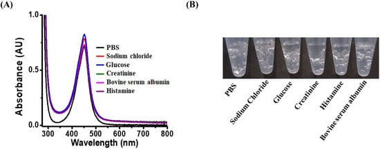 Whether the results were affected by the presence of sodium chloride, potassium chloride, creatinine, bovine serum albumin, and histamine, which are commonly present in real-world samples, was determined by conducting sensing experiments in the presence of these species. Because the concentrations of these selected interference species usually are not over 1 mM in real samples, 1 mM of each interference species was used for the preparation of the samples. E. coli O157:H7 was used as the model bacterium. Figure 5A shows the UV–Vis absorption spectra of the samples containing E. coli O157:H7 after the addition of sodium chloride (1 mM), potassium chloride (1 mM), creatinine (1 mM), bovine serum albumin (1 mM), and histidine (1 mM). The intensities of the maximum absorption at the wavelength of ~450 nm in all the absorption spectra were highly similar, indicating that the reaction was not considerably affected by the presence of the additives. Whether the bacterial catalase reaction itself was affected was determined by examining samples containing S. aureus and the same interference species as used above. Figure 5B shows the photographs of the samples. Apparently, all the samples generated observable bubbles, indicating that the additives did not affect the endogenous catalase reactions.