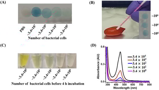 Alternatively, to improve detection sensitivity, the resultant cotton swab that was obtained after picking up bacteria from the surface of the sample was dipped in a vial containing nutrient medium, such as LB broth (0.4 mL), for ~4 h. The resultant bacterial cells in the vial were separated through centrifugation at 3750× g (rotor radius: 93 mm) for 5 min. The bacterial cells were resuspended in the phosphate buffer (pH 3, 0.2 mL) containing H2O2 (11.2 mM) and TMB (1.25 mM), followed by incubation at room temperature for 25 min. The resultant samples were treated with sulfuric acid (2 M, 2 µL) to stop the reaction. The resultant samples were then examined using UV–Vis absorption spectroscopy.