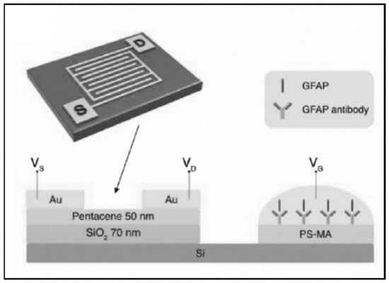 An organic field effect transistor (OFET) with an extended solution gate from Song et al. designed to measure GFAP. Reprinted with permission from [49]. John Wiley and Sons, 2017.