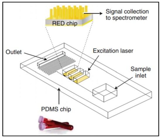 - Rickard, J.J.S.; Di-Pietro, V.; Smith, D.J.; Davies, D.J.; Belli, A.; Oppenheimer, P.G. Rapid optofluidic detection of biomarkers for traumatic brain injury via surface-enhanced Raman spectroscopy. Nat. Biomed. Eng. 2020, 4, 610–623. [Google Scholar] [CrossRef] [PubMed]
