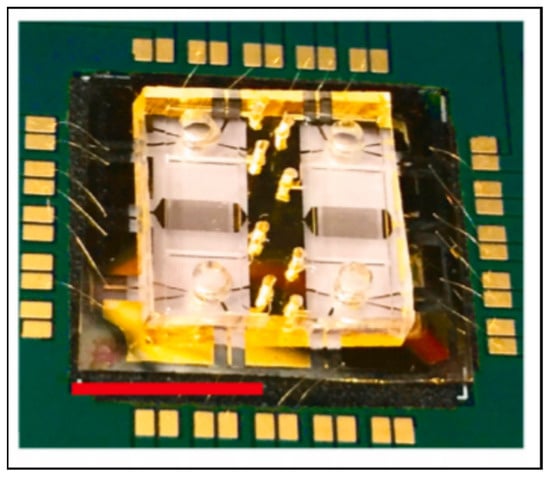 An ultra-high-frequency surface-acoustic-wave chip from Agostini et al. with the ability to multiplex up to four biomarkers. The red scale bar is 1 cm long. Reprinted with permission from [42]. Elsevier, 2021.