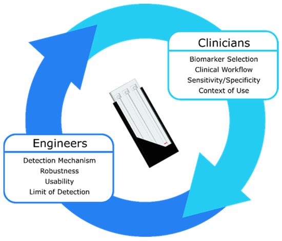 To fully assess the interconnectedness of clinical, assay, and device parameters, partnering with clinicians is paramount. Clinicians can determine which biomarkers to measure and what the cutoff concentrations should be, how the device will fit into existing clinical workflows, the required sensitivity and specificity for the test, and the context in which the device will be used clinically (e.g., in the field, in an ambulance, in an emergency department, etc.). These parameters then determine the features of the sensing system such as the detection mechanism (e.g., optical, electrochemical, acoustic, etc.), required robustness, usability, and limit of detection. Once a device exists to monitor biomarkers in the desired context of use, results from clinical validation studies can further refine the device features, allowing the feedback cycle between clinicians and engineers to repeat (Figure 6). Initial clinical validation can take place with a prototype device that does not achieve all the requirements for an ideal device. To accelerate translation, it is important to enter the feedback loop between clinicians and engineers as quickly as possible so that the prototype device can be refined based on clinical feedback.