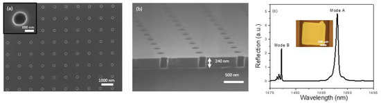 The design of the 2D PCS was done using Stanford Stratified Structure Solver (S4) software package [44]. According to our previous studies [32,42,43], Si PCS with lattice constant, a = 976 nm, air hole radius, r = 75 nm, and Si slab thickness, t = 240 nm leads to a center wavelength of Fano resonance around 1500 nm and presents a detection limit around 10−5–10−6 RIU. The PCS was first fabricated on a SOI substrate using e-beam lithography (EBL) and reactive-ion etching (RIE) [45]. Scanning electron micrograph (SEM) images of the fabricated device are presented in Figure 2a,b.
