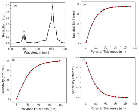 (a) Measured reflection spectrum of the transferred PCS sensor after coating. (b) Simulated spectral shift of PCS sensor for different polymer thicknesses. (c) RI sensitivity for different polymer thicknesses. (d) Thickness sensitivity for different polymer thicknesses.