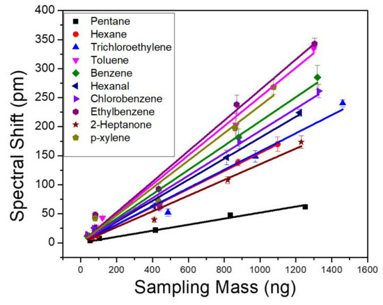 PCS sensor spectral shift obtained as a function of sampling mass for 10 VOCs. All analytes are measured with the same column temperature ramping profile and a flow rate of 1 mL/min.