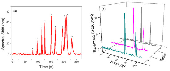 To demonstrate the separation performance of the integrated µGC and PCS sensor system, a mixture of 10 VOCs was prepared in a tedlar bag and was tested using a 10 m long Rtx-5MS column under the temperature programed condition. The separation and detection of 10 VOCs are shown in Figure 5a. All the peaks are symmetric with peak width (FWHM) less than 5.1 s. All analytes are well separated within 4 min, except ethylbenzene and p-xylene, which have partial overlap due to having very close boiling points and similar polarities, which is quite difficult to fully resolve using the Rtx-5MS column [54,55,56]. They are both non-polar and have similar partition factors. A reduced temperature would have resolved them, but the analyzing time would be increased. Therefore, a trade-off between separation and overall analysis time is required. The elution time could be further reduced using a higher flow rate or a shorter column at the expense of separation capacity. Details of the analyte mixture and their peak width (FWHM) and spectral shift are presented in Table 3. The sensing signal fully returns to baseline once the VOCs pass through, which demonstrates that the polymer in PCS is rapidly and completely regenerated, as are the efficient gas fluidics of the integrated µGC and PCS sensor system.