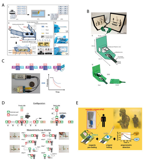 (A) A highly integrated sensing paper for wearable electrochemical sweat analysis. Reprinted with permission from [31], 2020 Elsevier; (B) a paper-based “pop-up” electrochemical device for analysis of Beta-Hydroxybutyrate. Reprinted with permission from [32], 2016 American Chemical Society; (C) a three-dimensional origami paper-based device for potentiometric biosensing. Reprinted with permission from [33], 2016 WILEY-VCH Verlag GmbH & Co; (D) origami multiple paper-based electrochemical biosensors for pesticide detection. Reprinted with permission from [10], 2018 Elsevier; (E) a wearable origami-like paper-based electrochemical biosensor for sulfur mustard detection. Reprinted with permission from [12], 2019 Elsevier.