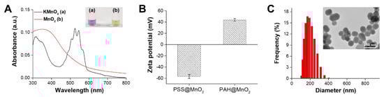 (A) UV–vis absorption spectra of KMnO4 and MnO2 in DI-H2O; the inset is a corresponding digital photo. (B) Zeta potential values of PSS@MnO2 and PAH@MnO2 (n = 3). (C) Dynamic light scattering (DLS) analysis results of PAH@MnO2 NPs; the inset shows the corresponding TEM.