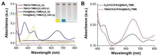 (A) UV-vis absorption spectra and visual colour changes of the catalysed oxidation of TMB in the absence or presence of PAH@MnO2; the inset is a corresponding digital photo; (B) UV-vis absorption spectra of the catalysed oxidation of TMB in the absence or presence of TMAO to prove the mechanism of proton depletion by TMAO.
