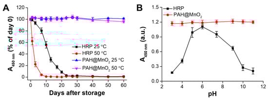 (A) The stabilities of HRP and PAH@MnO2 after storage at 25 and 50 °C for periods of 1–60 days. PAH@MnO2 showed no decrease in oxidisability towards H2O2/TMB after 60 days of storage at 50 °C. The values are means ± SD (n = 3); (B) the absorbances at 450 nm of HRP and PAH@MnO2 in the presence H2O2/TMB in PBS with various pH levels. The values are means ± SD (n = 3).