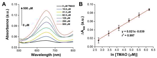 (A) Typical UV-vis absorption spectra of TMB for the detection of TMAO at various concentrations using the colour-switch method based on PAH@MnO2; (B) the linear calibration curve between A650 and the TMAO concentration. The values are means ± SD (n = 6).