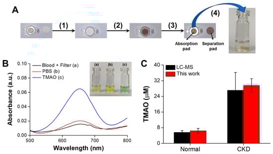 (A) The design and principle of colourimetric TMAO detection using whole blood based on the combination of a plasma separation pad as a erythrocyte trap and an absorption pad as serum/plasma trap to filter erythrocytes and haemachrome as follows: (1) the absorption pad is covered with the separation pad; (2) 50 μL of whole blood is dropped on the separation pad; (3) the serum/plasma is collected in the absorption pad and (4) the absorption pad with serum/plasma is placed into a glass vial for TMAO detection; (B) UV-vis absorption spectra and visual colour changes of the catalysed oxidation of TMB in two groups to confirm that the erythrocytes and haemachrome of whole blood could be filtered and that normal serum/plasma would not cause proton depletion, similar to PBS; the inset is a corresponding digital photo; (C) TMAO concentrations in 8 whole blood samples from normal rats and 8 whole blood samples from CKD that were measured using LC–MS and the proposed colourimetric assay for CKD monitoring. The values are means ± SD (n = 8).