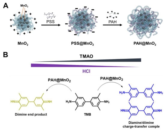 (A) An illustration of PAH@MnO2 synthesis; (B) the design and principle of colourimetric TMAO detection based on proton deposition of HCl by TMAO.