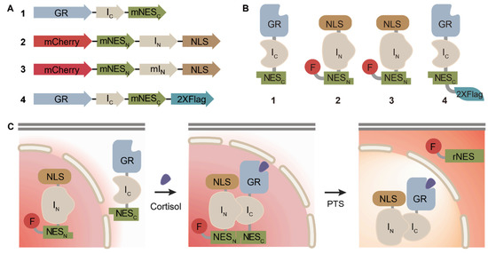 In order to screen natural products for GR effectors, we prepared a sensing platform that can report the interaction between the analytes and GR in living cells through fluorescence translocation. Previously reported sensing probes constructed with GR as a target recognition element and inactivated split-signal peptides conjugated to fluorescent cargo as a reporter element were used in this study [11]. The cortisol-detecting probes were prepared using the fast-reacting Nostoc punctiforme (Npu) DnaE split-inteins and the split nuclear export signal (NES) peptide (Figure 1A,B). Two fusion proteins were prepared; each contains the N- or C-terminal fragment of split-intein along with the corresponding N- or C-terminal fragment of split NES peptide as the extein. GR was inserted at the N-terminus of C-intein (IC) containing fusion protein to generate the gene encoding protein 1, GR-IC-NESC. The mCherry and nuclear localization signal (NLS) genes were inserted at N- and C-terminus of N-intein (IN) containing fusion protein, respectively, to generate the gene encoding protein 2, mCherry-NESN-IN-NLS. A non-functional mutant fusion protein 3, mCherry-NESN-mIN-NLS, was prepared by replacing the first amino-acid of N-intein from Cys to Ala, thereby abolishing the protein splicing activity. Flag-tagged fusion protein 4, GR-IC-NESC-Flag, was also prepared for Western blot analysis. Genetically encoded sensor cells were prepared by transiently transfecting HeLa cells with a pBI-CMV1 vector containing two constitutive promoters encoded with two fusion proteins, 1 and 2. Protein 2 containing the fluorescence signal is initially located in the nucleus of the sensor cells owing to the NLS peptide (KRPAATKKAGQAKKKKLD), whereas protein 1 is located in the cytosol. Cortisol binds to GR and prompts the nuclear-translocation of protein 1 to trigger an intein-mediated conditional protein splicing (CPS) reaction, resulting in the reconstitution of the NES signal peptide (KVYPIILRLCFNLSL) [19,27]. The reconstituted signal peptide is instantly activated without tedious refolding steps with the consequent translocation of the fluorescent cargo to the cytosol, reporting the presence of the target, cortisol (Figure 1C).