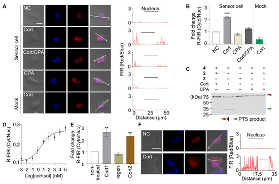Characterization of cortisol (Cort)-detecting sensor cells. (A) Sensor cells co-expressing fusion proteins 1 and 2 exhibited red fluorescence from mCherry in the nucleus prior to stimulation (row 1). The fluorescence signal was translocated to the cytosol upon Cort treatment (row 2). Mock sensors containing fusion proteins 1 and 3 did not respond to Cort (row 3). The passive GR antagonist, CPA, inhibited the Cort-induced signal translocation (row 4 and 5) (scale bar = 20 µm). (B) Fold-change in the ratio of red fluorescence intensities of the cytoplasm to that of the nucleus (R-FIR Cyto/Nuc) over untreated control sensor cells is calculated. Data were analyzed by one-way ANOVA using the Tukey multiple comparison test (* p < 0.05, ** p < 0.01, *** p < 0.001). (C) Western blot analysis revealed the formation of reconstituted signal peptides via protein trans-splicing. (D) Dose–response of R-FIR Cyto/Nuc signal was plotted and the limit of detection (LOD) was determined to be 1.6 nM. (E) The Cort-treated sensor cells were spontaneously regenerated and used multiple times to detect Cort without a notable loss of function. (F) HEK293T cell-derived sensor cells were treated with Cort and exhibited fluorescence signal translocation.