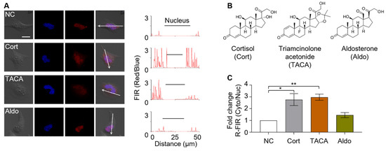 Evaluation of Cort-detecting sensor cells for function-based screening. (A) The sensor cells responded to Cort and the GR agonist, triamcinolone acetonide (TACA), while discriminating against the structural analogues, aldosterone (Aldo) (scale bar = 20 µm). (B) The structures of Cort, TACA, and Aldo. (C) Fold change in the ratio of red fluorescence intensity from the cytoplasm to that of the nucleus (R-FIR Cyto/Nuc) over untreated control sensor cells is calculated. Data were analyzed by one-way ANOVA using the Tukey multiple comparison test (* p < 0.05, ** p < 0.01).