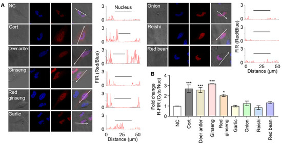 First, deer antlers and ginseng extracts were screened; deer antlers are known to possess native cortisol and ginseng possesses multiple GR effectors, such as ginsenosides Rg1 and Re [35,36,37,38]. Sensor cells treated with either deer antlers or ginseng extracts reported the presence of GR effectors through fluorescence translocation with R-FIR Cyto/Nuc values of 0.26 or 0.32, respectively (Figure 4). Our results indicate that the sensor cells are suitable to screen natural product extracts for GR effectors; therefore, we expanded our screening to include more analytes. We analyzed red ginseng extracts and saponin-rich plant extracts because the GR effectors in ginseng, Rg1 and Re, belong to the saponin family. Extracts of onion, garlic, red bean, and reishi mushroom were chosen as the saponin-containing plant extracts. The results reveal that only the red ginseng extract induced signal translocation in sensor cells, suggesting that other saponin family compounds in the tested extracts might not be potent GR effectors or might not to be present in working concentrations [39,40].