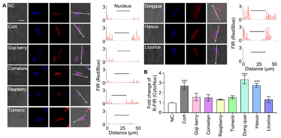 Next, the following seven herbal extracts from frequently prescribed oriental medicines were selected as analytes: goji berry, cornelian berry, black raspberry, turmeric, dongquai, hasuo, and licorice (Table S1). Sensor cells were individually treated with the same amount of each plant extract and the fluorescence translocation was monitored. Sensor cells treated with dongquai and hasuo both reported the presence of GR effectors in their analytes by fluorescence translocation with R-FIR Cyto/Nuc values of 0.32 and 0.28, respectively (Figure 5). Sensor cells treated with goji berry, cornelian berry, black raspberry, turmeric, and licorice exhibited negligible signals, with R-FIR Cyto/Nuc values of 0.16, 0.15, 0.13, 0.15, and 0.13, respectively. Notably, to our best knowledge, GR effectors have not been identified in dongquai and hasuo extracts before this study. Although licorice is known to possess 18β-glycyrrhetinic acid, which is an effector for GR and a mineralocorticoid receptor [41,42], no fluorescence translocation was observed in the sensor cells. This could be caused by low concentrations of active ingredients or ineffective extraction.