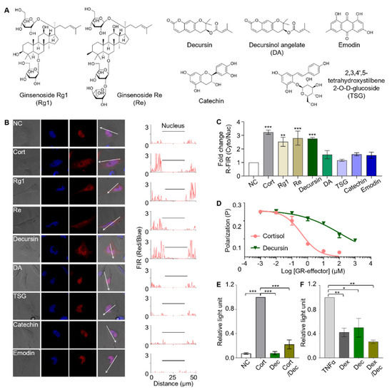 Screening the major components of ginseng, dongquai, and hasuo using sensor cells to identify GR effectors. (A) Structures of the major components in ginseng, dongquai, and hasuo. Rg1 and Re are components of ginseng, decursin and decursinol angelate (DA) are components of dongquai, 2,3,4′,5-tetrahydroxystilbene 2-O-D-glucoside (TSG), catechin, and emodin are components of Hasuo. (B) The sensor cells were challenged with seven major components derived from medicinal plants; they responded to Rg1, Re, and decursin (scale bar = 20 μm). (C) Fold change in the ratio of red fluorescence intensity from the cytoplasm to that of the nucleus (R-FIR Cyto/Nuc) over untreated control sensor cells is calculated. Data were analyzed by one-way ANOVA using the Tukey multiple comparison test (* p < 0.05, ** p < 0.01). (D) In vitro competitive binding assay demonstrating that decursin binds to GR with much lower affinity than that of cortisol. (E) Glucocorticoid response element (GRE)-mediated transactivation study revealed that decursin does not activate GRE-mediated transactivation. (F) The NF-κB-mediated trans-repression study revealed that decursin plays a role in NF-κB-mediated trans-repression (* p < 0.05, ** p < 0.01, *** p < 0.001).