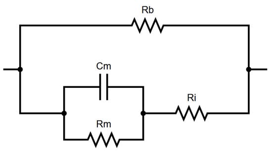 An equivalent electrical circuit for measuring the cells’ impedance is presented in Figure 2. As seen from the equivalent circuit, the total measured impedance consisted of the buffer resistance (Rb), the intracellular resistance (Ri), and the cell membrane impedance, which included a resistor (Rm) and a capacitor (Cm) in parallel. The buffer resistance exhibited a purely ohmic behavior; the intracellular resistance was also modeled as a resistive junction (based on the extracellular fluids and proteins which were conductive) []. The cell impedance, in contrast to the other components, was frequency dependent, and so the applied frequencies should be chosen accordingly. The equivalent capacitor was based on the cell size; the larger the cell, the more lipid membrane was sandwiched between proteins, therefore increasing the capacitance. Based on the literature [], the cell membrane resistance prevailed over the measurement due to the presence of the Cm element which acted as a bypass capacitor in a lower frequency range, impeding the current from passing through the intracellular space. Hence, the whole cell population in the buffer was treated as a unified resistor whose value depended on each cell membrane’s impedance. However, in a high-frequency range, the cell membrane impedance was considered as a high-pass filter and allowed the determination of the intracellular resistance, which had a much lower value compared to the total measured impedance. Therefore, by applying a frequency sweep, the cell contribution to the overall impedance could be highlighted, given the fact that the rest of the components of the system exhibited a purely ohmic, frequency-independent behavior.