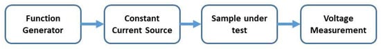 The four-point impedance methodology required four probes in the line. The current was applied in the two outer electrodes, thus the impedance was extracted by measuring the voltage in the two inner electrodes. The four-point probe impedance “Z” could be defined as the ratio V/I, where “V” is the measured voltage drop and “I” is the current passing through the sample [].