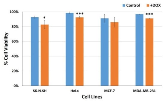 Graphic representation of the viability percentages of SK-N-SH, HeLa, MCF-7 and MDA-MB-231 cell lines before (blue columns) and after 30 min treatment with the anticancer agent doxorubicin (orange columns). * p < 0.05, *** p < 0.001 significantly different from the untreated control cells.