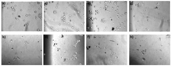 The determination of cell viability in the cell suspensions was performed by the Trypan Blue dye exclusion assay [] based on the principle that intact membranes of living cells exclude certain dyes, whereas dead cells do not. Equal parts of 0.4% trypan blue dye solution (Merck KGaA, Darmstadt, Germany) were mixed with the cell suspension, incubated for 2–3 min at 25 °C, and afterward inserted into the hemacytometer counter. All cells (clear and blue) in each large square in each of the four hemacytometer’s corners were counted by an inverted light microscope (ZEISS Axio Vert.A1, Carl Zeiss Microscopy, LLC, White Plains, NY, USA), and the pictures were processed by ZEN lite software. Each experiment was repeated four times. The percentage of viable cells was calculated by the following Equation: