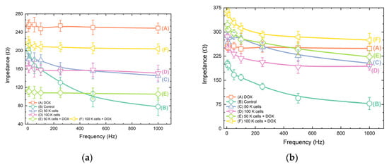 The normalized impedance variations frequency curves of the four-point probe sensor under different cellular concentrations, treated or untreated with DOX, are shown in Figure 9. In all cases, the normalized impedance is higher at low frequencies (5–100 Hz) and drops at higher frequencies till a plateau is reached.