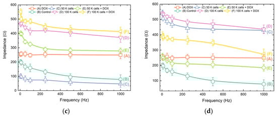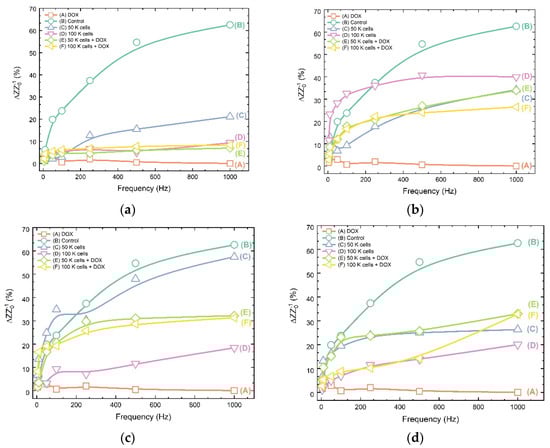 where Z0 was the impedance at the first frequency and Z is the alternating frequency impedance of the solution tested for every cell line, with or without DOX. As it is observed, the sensitivity is frequency-dependent whereas in all the cases it is dropping with the increase in the cells’ population. The limit of detection and resolution parameters are considered vital, nevertheless, no respective experiments have been carried out as of yet. Further ongoing research is being conducted toward this goal.